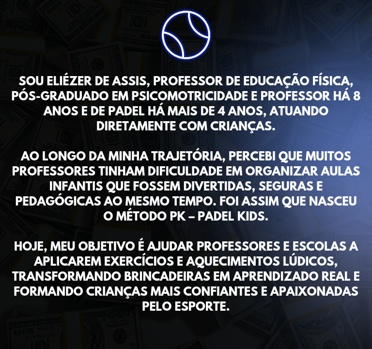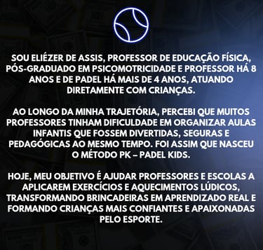 Enquanto muito professores improvisam nas aulas kids, o Método PK - Padel Kids te ensina, como aplicar exercícios e aquecimentos lúdicos que desenvolvem coordenação, aprendizado e diversão, mesmo que você esteja começando agora no padel infantil
